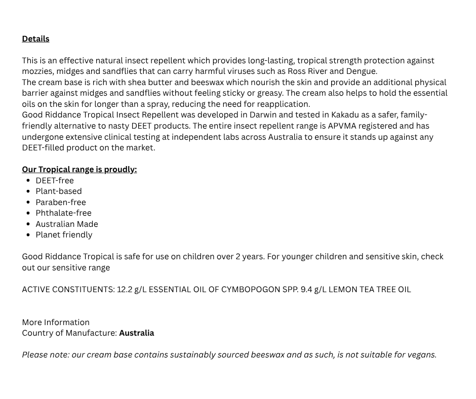 Being able to use the Australian Made logo means all of our products have undergone a third-party accreditation process to certify that our products are “genuinely Australian”. When you're looking to buy one of the best mozzie and insect repellents, then you can rely on Good Riddance Insect Repellent.